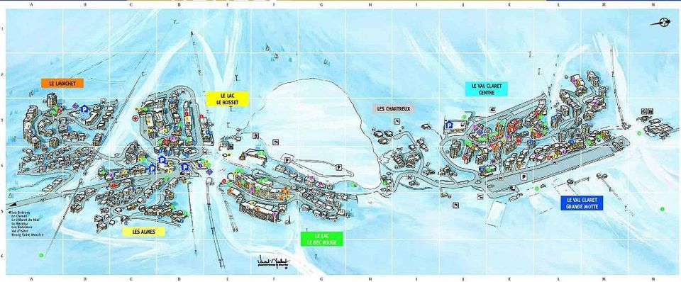 Tignes has four main villages. The two highest are the main ones. The frozen lake makes the separation between "Tignes le lac" and "Tignes Val claret". Free shuttles run until late at night so that many people travel from one side to the other all day long.